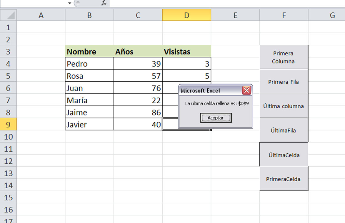 En este ejemplo mostramos cómo conocer de una tabla ubicada en una hoja de Excel, la primera fila rellena, la primera columna rellena, la última fila y columna rellenas, o la primera o última celda rellena.