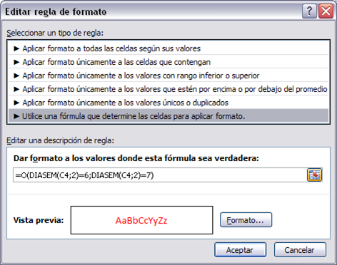 Si quieres que aparezcan también los sábados en rojo, puedes añadir la función =O(DIASEM(C4;2)=6;DIASEM(C4;2)=7), de esta forma comprueba si se cumple que la fecha de la celda es igual a 6 o 7, los días de la semana.