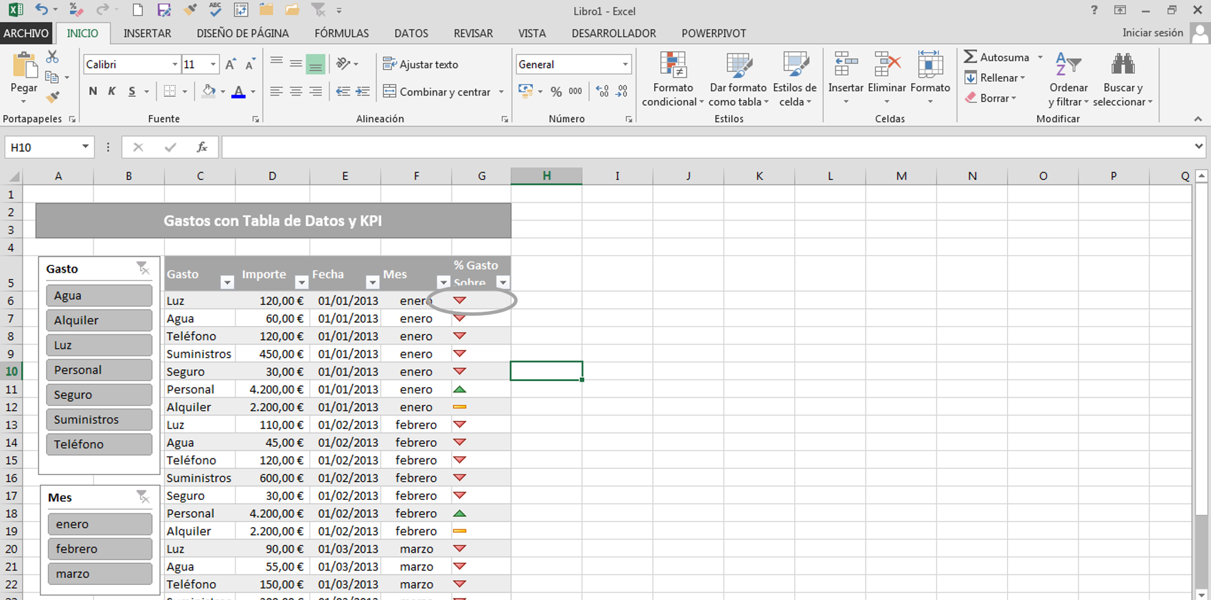 En una tabla de datos podemos añadir un Formato Condicional con Iconos, para calcular por ejemplo el porcentaje que supone cada una de las partidas de gastos sobre el total. En este ejemplo vamos a utilizar diferentes herramientas  para crear un Informe con un KPI de una forma rápida y sencilla.