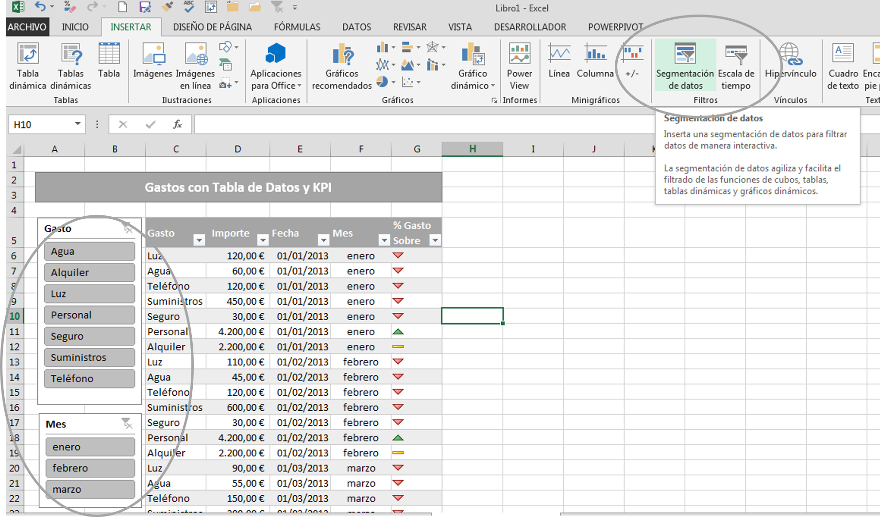 Por último puedes insertar una Segmentación de datos, para filtrar la tabla de una forma más sencilla y visual desde Insertar >Filtros>Segmentación de datos.