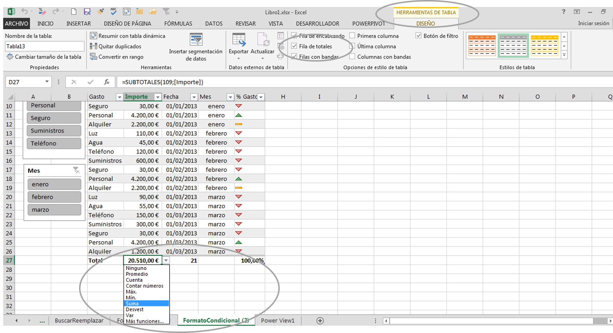 Ahora el formato es más atractivo y además se añade al hacer clic sobre la tabla, la ficha Herramientas de Tabla.FormatcondicKPI4 Si además haces clic en la casilla Fila de totales de la barra de herramientas al final de ésta, aparecerá una nueva fila donde puedes elegir una función como por ejemplo SUMA,PROMEDIO, etc.