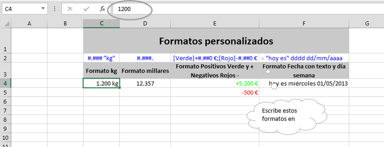 En la celda C4 mostramos 1.200 kg y el dato se almacena como un número 1200. Lo escrito entre comillas lo devuelve en la celda «kg».