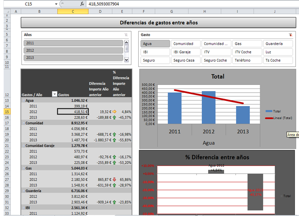 En este ejemplo hemos creado un control de los gastos de una casa con diferentes informes para conocer en todo momento cómo está cada una de las partidas de gasto como la luz , teléfono, etc. con respecto a otros años.