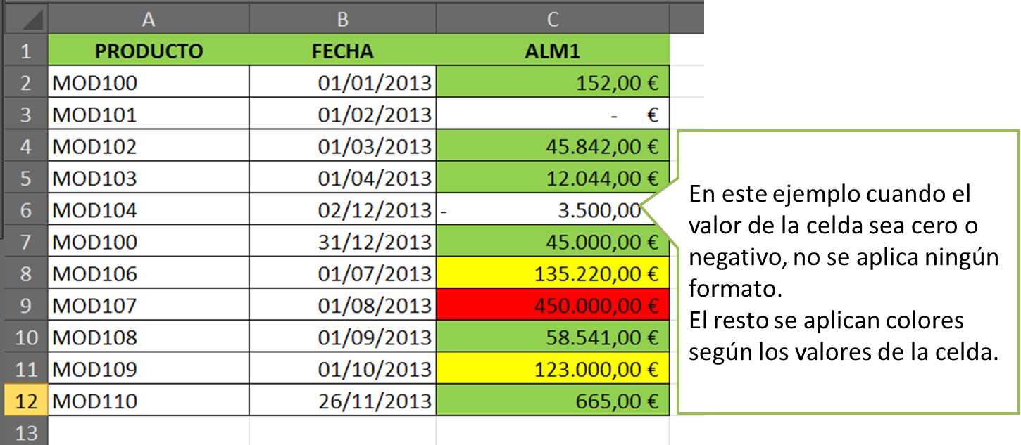 Marcando la opción Detenerse si es verdad, se parará cuando cumpla la primera condición, si no lo marcamos pasará a siguiente <100.000 y pintara de verde los ceros y negativos.