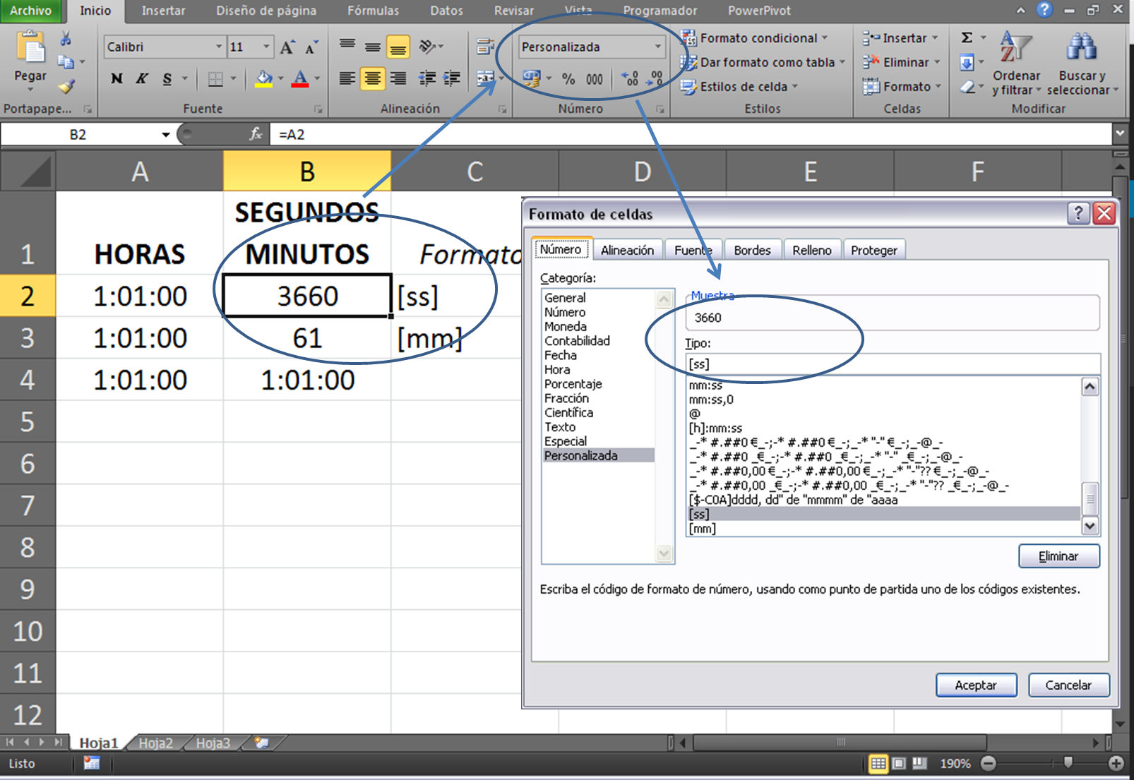 Si nos encontramos con una celda que contiene horas con ese formato h:mm:ss podríamos mostrarla en segundos o minutos.