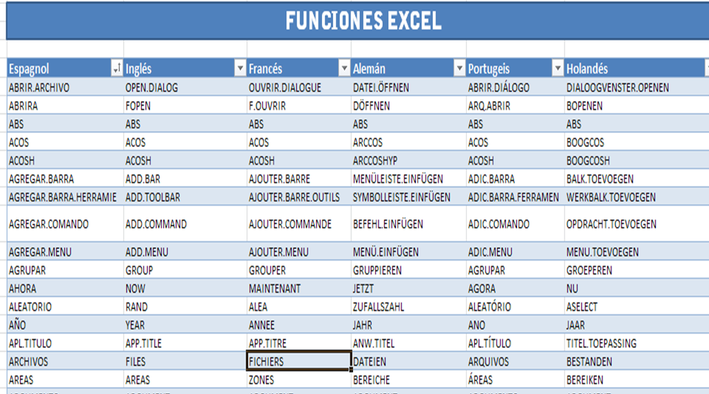 Podéis descargar en el enlace un archivo de excel , donde encontraréis una tabla con las Funciones de Excel en Español, Inglés Francés, Alemán, Portugués y Holandés.