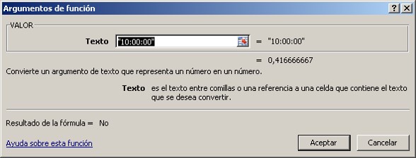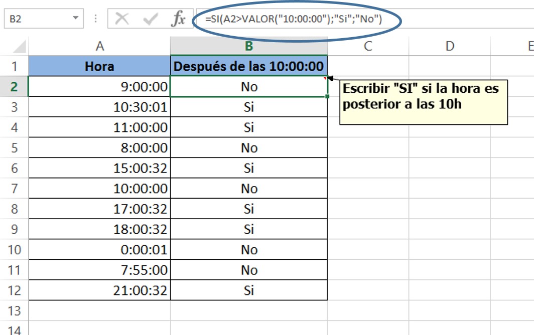 La función que utilizamos en este ejemplo es un condicional para obtener un «Si» o «No», pero en este caso para poder añadir una hora escrita en el primer argumento «10:00:00» y poder compararla con la celda, tenemos que trabajar con la función Valor =VALOR(«10:00:00») ya que la hora («10:00:00») es un texto y la almacenada en las celdas de la columna A un valor.