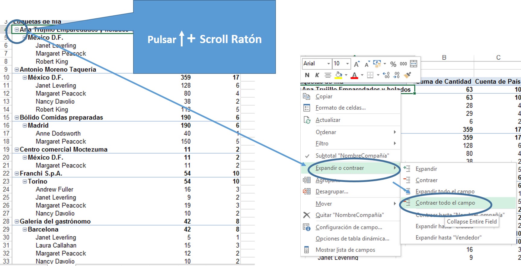 En un Tabla Dinámica muchas veces queremos consultar o mostrar los datos de campos con expandir  o contraer campos, para ello debemos posicionarnos en el – o + del elemento del campo y botón derecho Expandir o Contraer.
