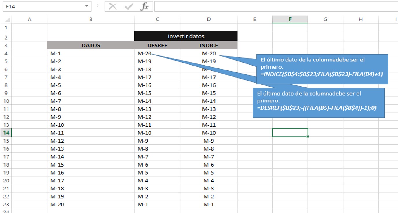 Al arrastrar esta fórmula la siguiente celda será DESREF($B$23;-1;0) por lo tanto obtendremos el valor de una fila menos de B23 «M19» y así sucesivamente.