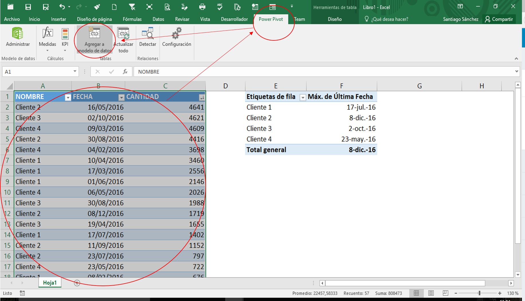 1º – Mandamos los datos a PowerPivot, seleccionamos la tabla y desde la pestaña PowerPivot>Agregar a modelo de datos