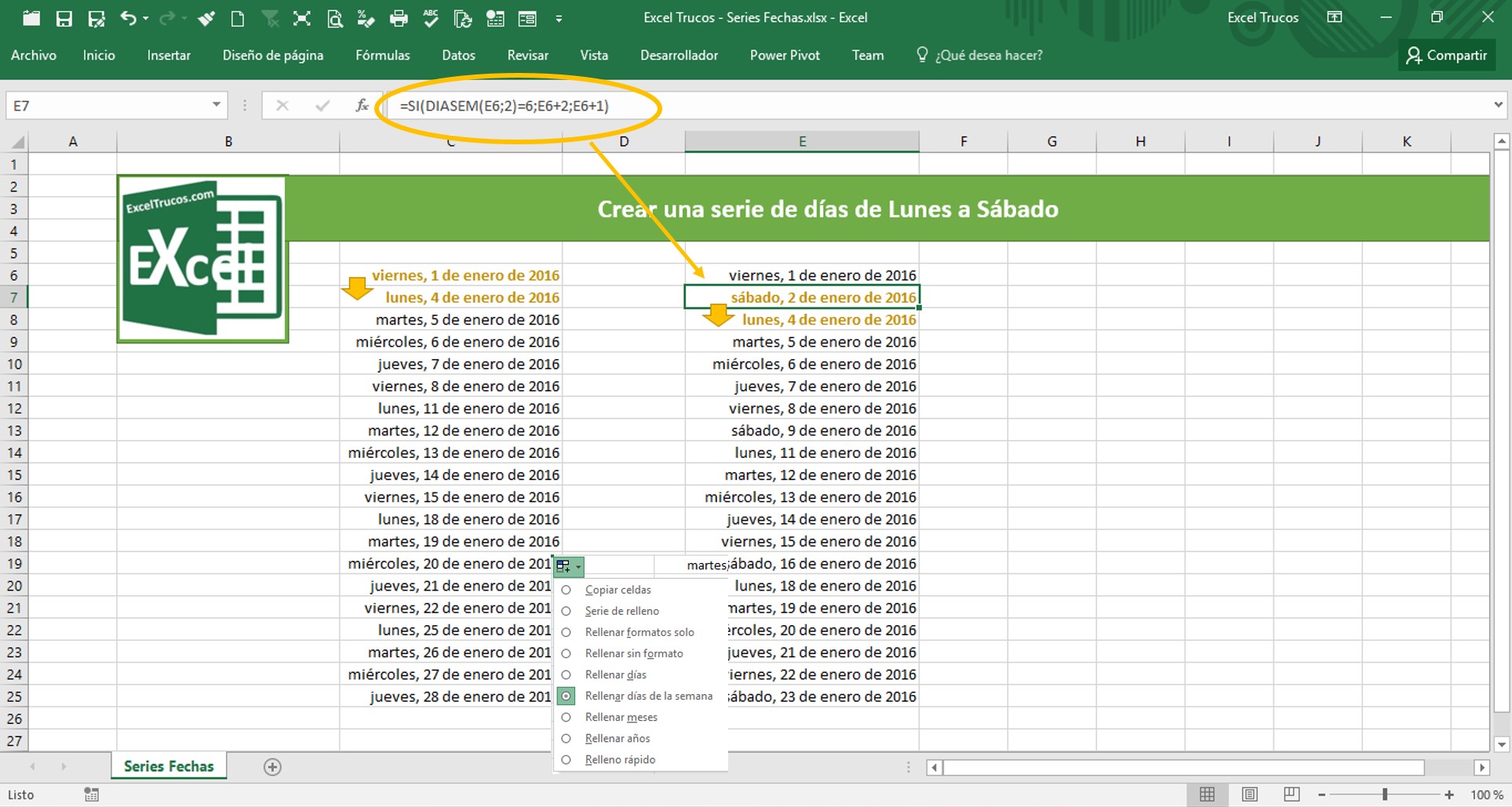 Cuando en una celda tenemos una fecha y la arrastramos hacia abajo, Excel incrementa un día, además con las Opciones de autorrelleno podemos seleccionar Rellenar días de la semana y de esta forma saltará los Sábados y Domingos.