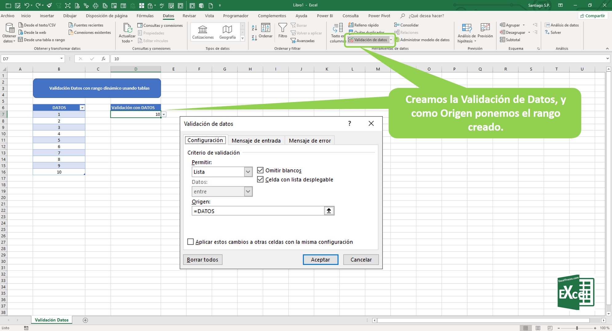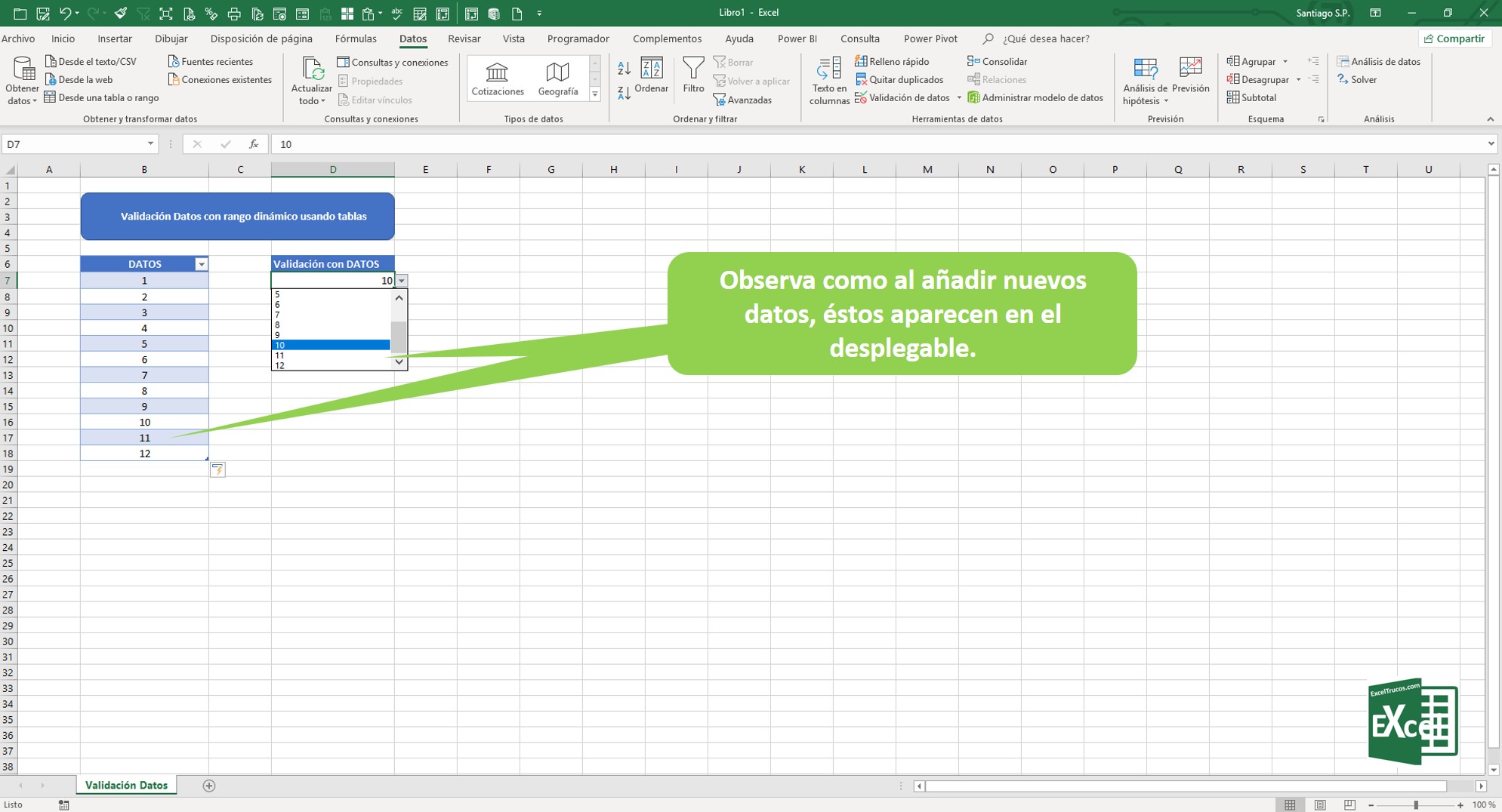 Muy buen contenido! Muchas gracias por compartir!!! La Pregunta sería…. Cómo sería si fuera así: «Por ejemplo, tenemos un listado de 10 valores, si añadimos el 11, éste debe aparecer en el desplegable de la validación datos.» pero que NO muestre los datos repetidos?