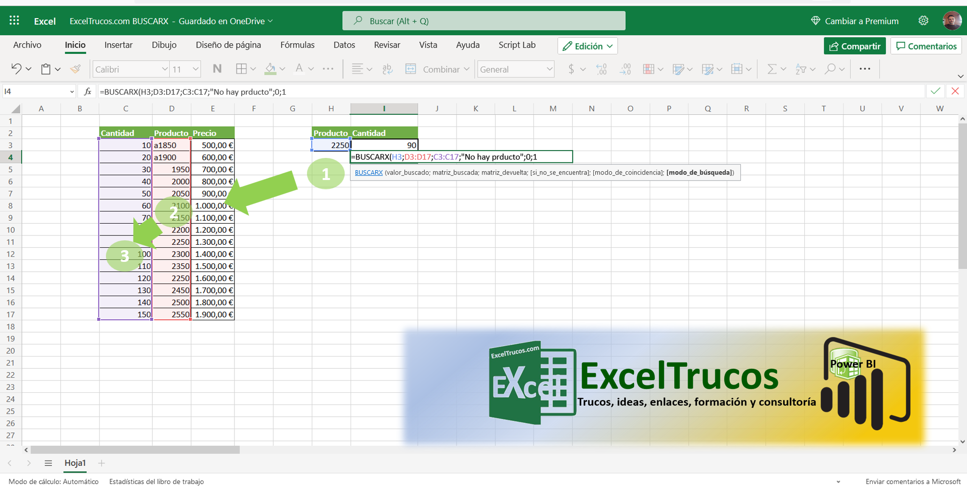 En el ejemplo que mostramos a continuación, buscamos el producto 2250 (1) en la columna D (2), y queremos obtener la cantidad vendida que le corresponde en la columna C (3)