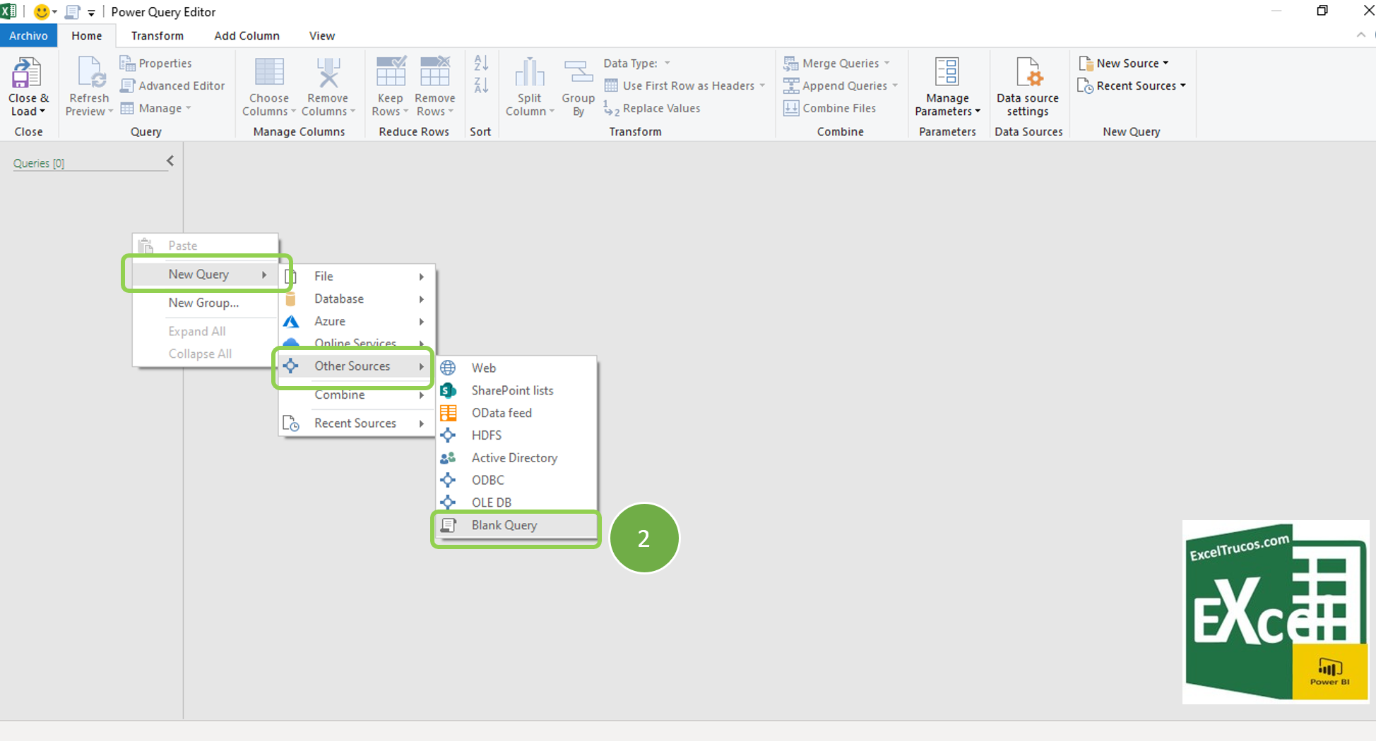 En la ventana de PowerQuery hacemos clic derecho debajo de Queries(0) y añadimos una BlankQuery o Consulta en Blanco (2)